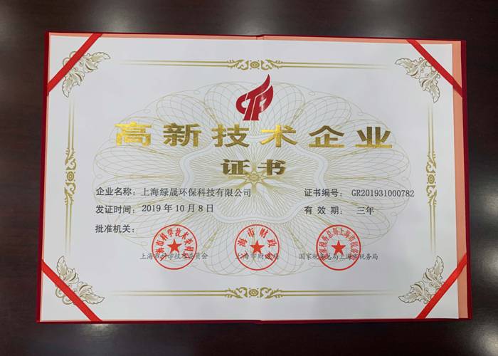 根据国家《高新技术企业认定管理办法》和《高新技术企业认定管理工作指引》的相关规定,经全国高新技术企业认定管理工作办公室认定,上海绿晟环保科技有限公司获批高新技术企业。